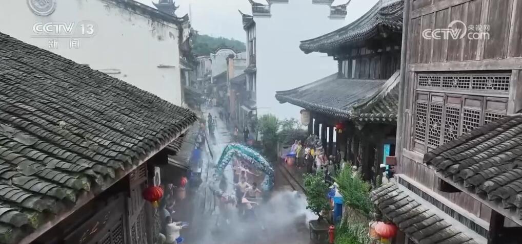 重庆市铜梁区的安居古城正在进行端午节的非遗文化表演——水云龙。10名赤膊的汉子舞动着一条18米的蓝色水云龙,整条龙上下翻腾、左右腾挪,在两边明清时期的老屋之间穿行。而站在两旁的居民和游客会拿着水瓢或者水盆,将清水泼向正在舞动的水云龙。虽然水云龙所到之处,大家衣衫都可能打湿,但是大家都乐在其中。