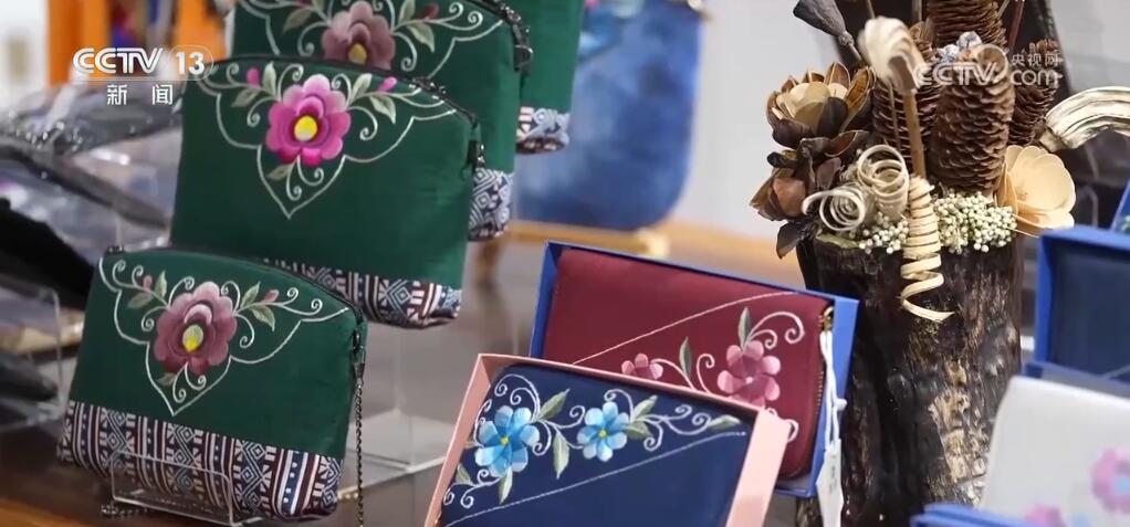 这样精美的非遗手工艺品,不仅在博物馆里能见到,我们日常生活也能用得上。您现在看到的,就是在楚雄特产店里销售的成衣、丝巾、背包。这些都是纯手工绣出来的。销售非常火爆。)