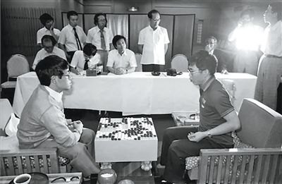 1985年8月,在中日围棋擂台赛上,聂卫平穿着胸前印有“中国”字样的运动服对阵日本选手。资料图片
