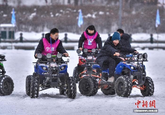 图为29日,来自宁夏的青少年在乌鲁木齐市南湖市民广场体验冰雪娱乐项目。中新社记者 刘新 摄